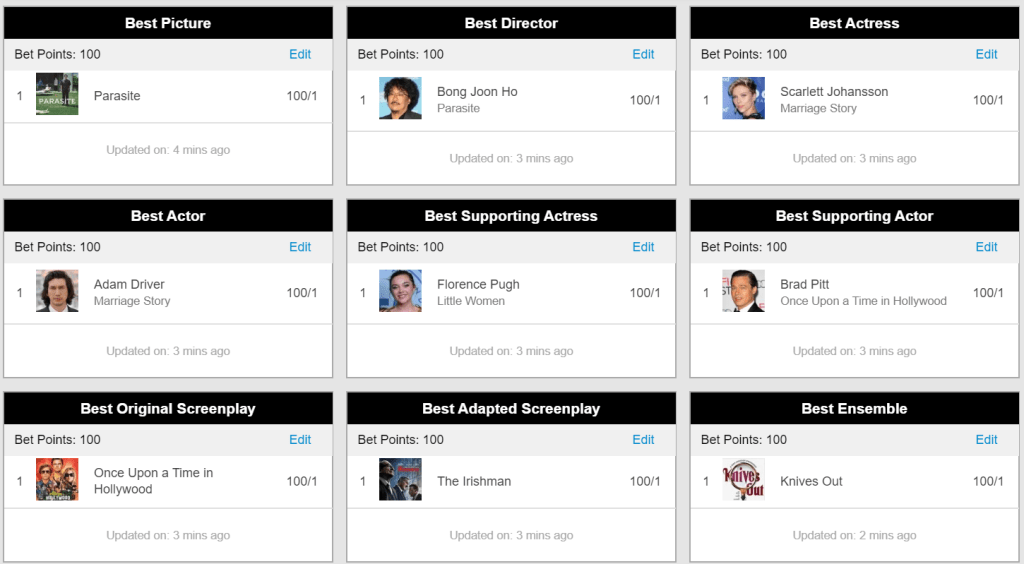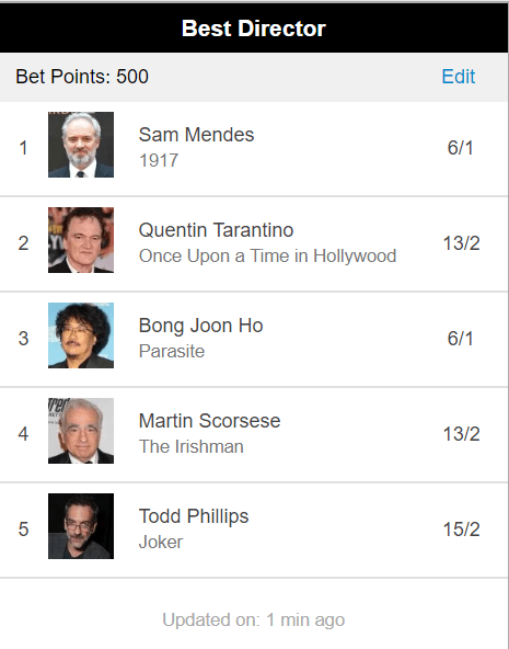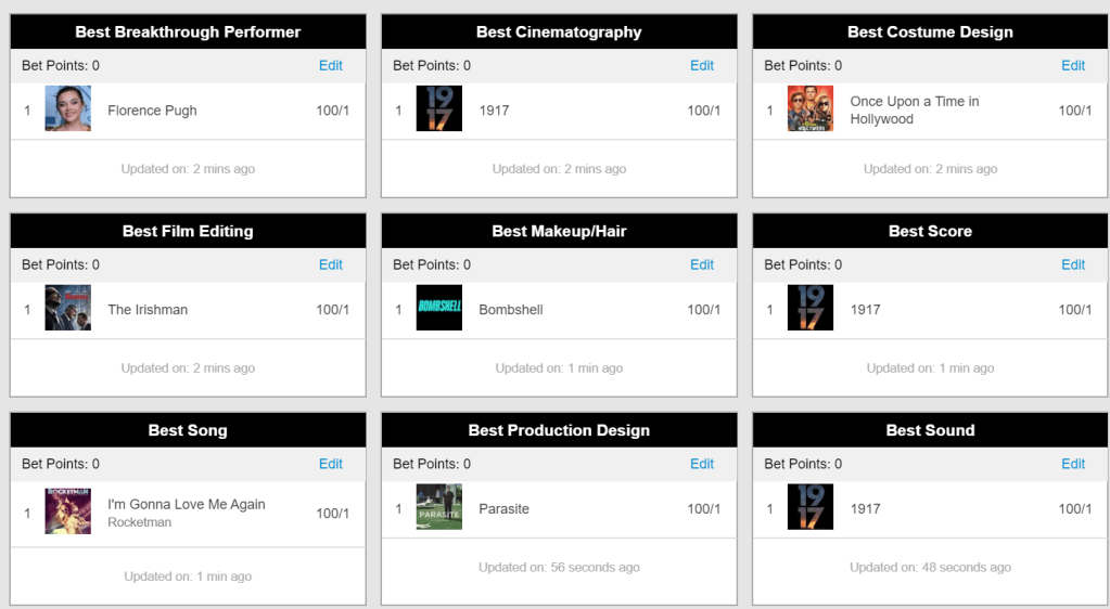Look at the facts, people: after decades of unfairly snubbing movies in this franchise, both the previous two James Bond films (Skyfall and Spectre) have won Best Original Song. Spectre isn’t even that good of a movie and it can still call itself Oscar-winning for its song! The original song for No Time to Die, recently revealed to be sung by the Grammy-winning Billie Eilish, is definitely a lock for BOS if not a win, unless it’s somehow really bad.